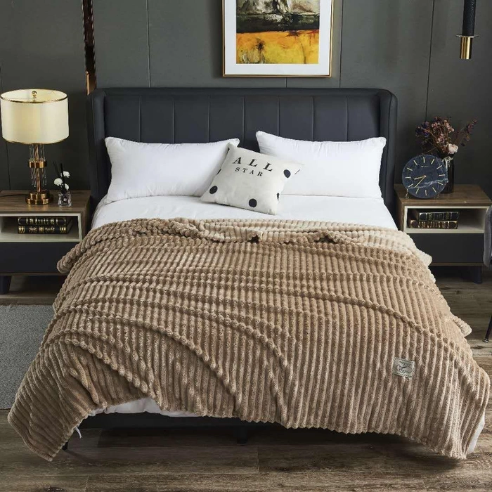 Плед дуже м'який і приємний на ощупь. Його дизайн виробів з тисненням у вигляді смужок. Полотно еластичне, має високу міцність, повітропроникне і чудово зберігає тепло. Має легкий вагу і чудово піддається як ручному, так і машинному пранню в делікатному режимі. Швидко сохне і не змінює своєї початкової форми. Після багатьох прань не линяє і зберігає насиченість фарб.