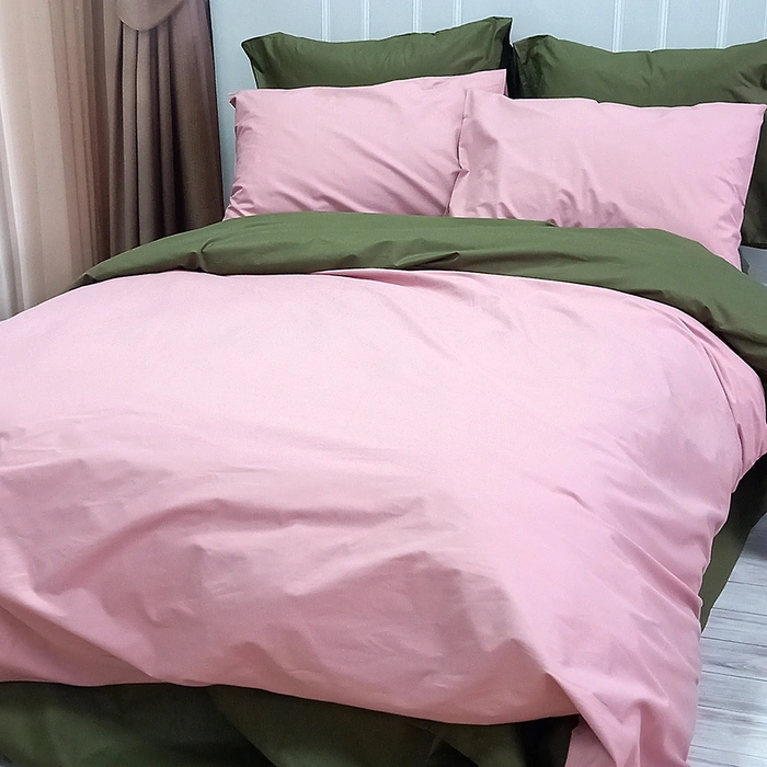 Постільна білизна ДУЕТ Пудра/Темний Хакі Ранфорс - Полуторний на резинці