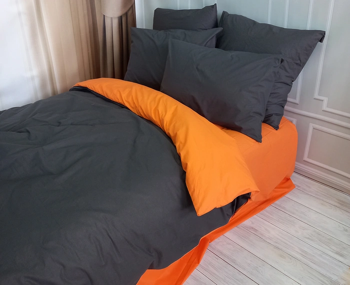 Постельное белье ДУЭТ Антрацит/Оранжевый Ранфорс - Семейный на резинке